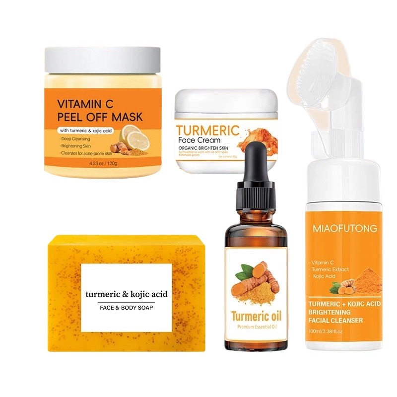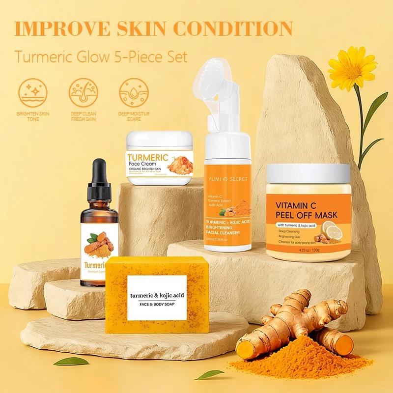 Deze 5-delige kurkumaset pakt acne littekens, pigmentvlekken, een doffe teint en grote poriën aan en biedt een complete dagelijkse routine voor een zichtbare verbetering van de huid.