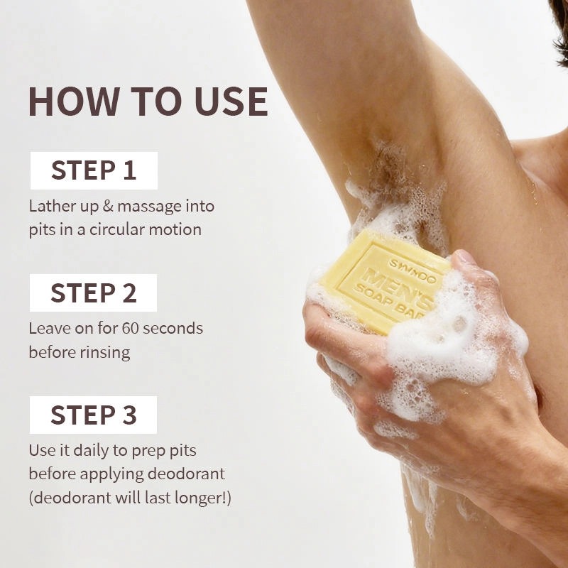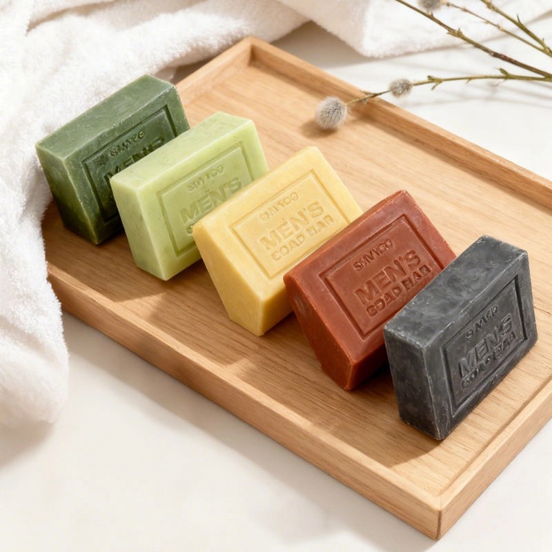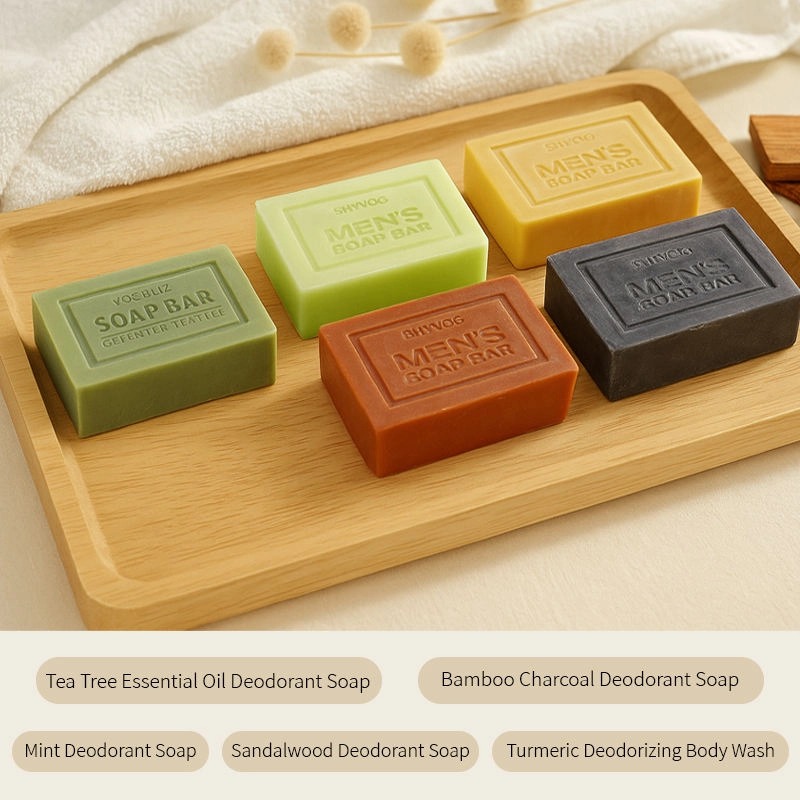 Een collectie van 5 varianten deodorantzeep voor mannen, met elk een eigen geur en specifieke werking, samengesteld met plantenextracten voor een milde reiniging en effectieve deodorantverwijdering.